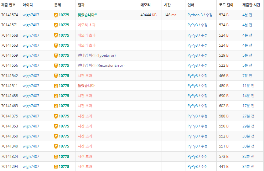pypy가 재귀에 약하다는걸 그때서야 기억해내고 파이썬으로 옮겨서 맞았다