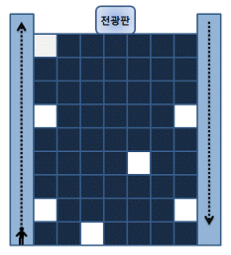 A 씨는 어떤 회사 빌딩의 수위로 일하고 있다. A 씨는 밤 12 시가 되면 이 빌딩 사무실의 켜져 있는 모든 등과 건물 옥상에 있는 전광판을 소등한 후 퇴근한다. 그런데 이 빌딩은 특이한 구조로 이루어져 있다. 각 층에는 동일한 개수의 사무실이 일렬로 늘어서 있고, 건물 양편에 엘리베이터가 있다. 왼쪽에 있는 엘리베이터는 올라갈 때만 탈 수 있는 엘리베이터이고 오른쪽에 있는 엘리베이터는 내려갈 때만 탈 수 있는 엘리베이터이다. 전광판을 끄기 전에는 왼쪽에 있는 엘리베이터만 탈 수 있고, 끈 이후에는 오른쪽에 있는 엘리베이터만 탈 수 있다.