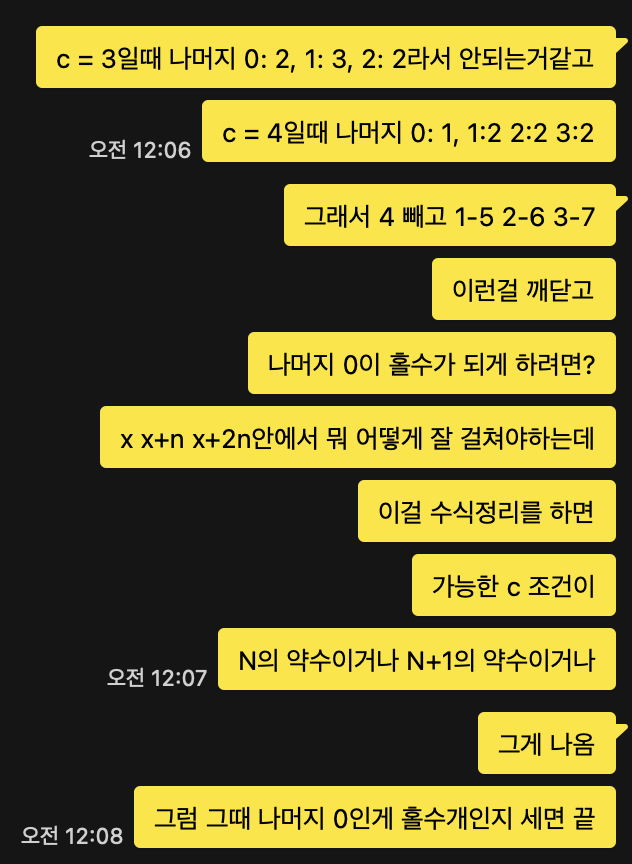 두명은 "1개, 2개는 세면 되고, 3개 있으면 홀짝을 결정할 수 있고, 4개는 3개를 주지 않기 위해서는 1/2개로 나누는 상황밖에 없고, 5개 이상은 홀짝성을 맘대로 고를 수 있다" 라는 관찰을 해놨다.